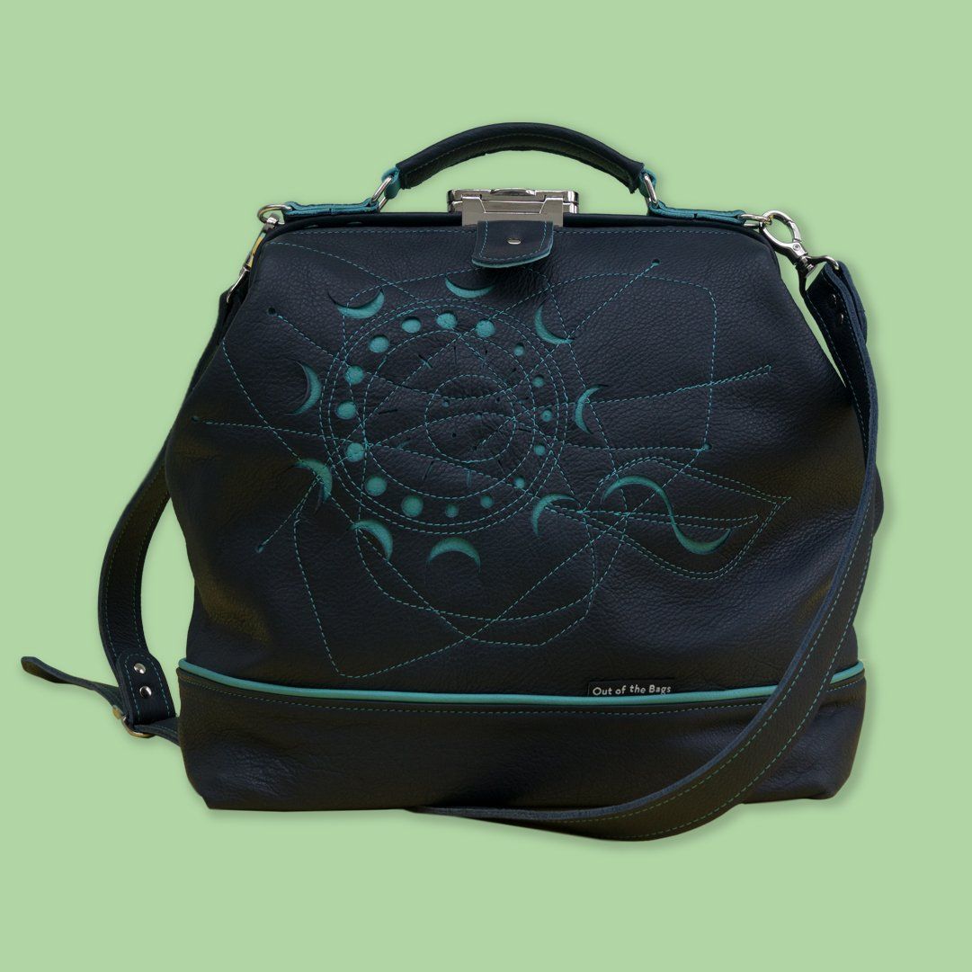 Deze dokterstas is helemaal naar wens gemaakt door de verwerking van een gestileerde boem in het leer op het voorpand. Dit is gedaan door het uitsnijden in het leer en het aanbrengen van een contrasterende kleur leer daarachter.