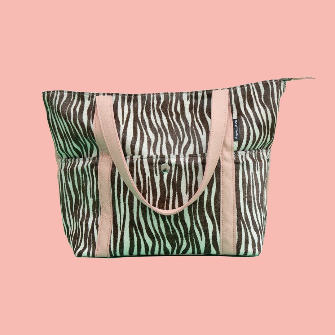 Prachtige luiertas van stoer vachtleer in zebraprint gecombineerd met babyroze leer. Deze tas is ook in andere kleuren te bestellen.