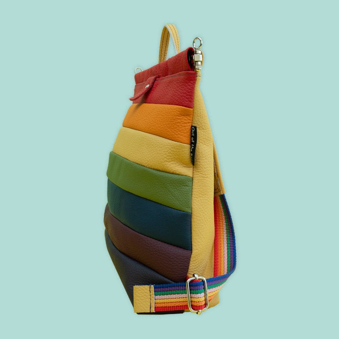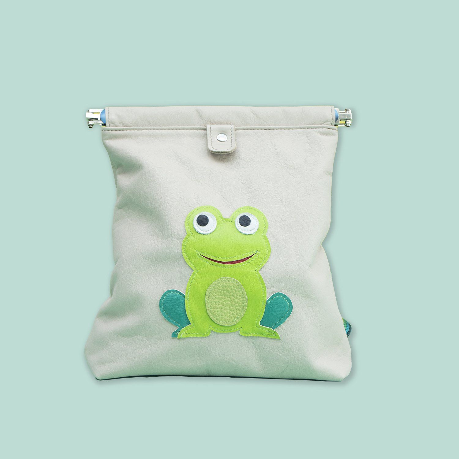 Peuterrugzakje in zachtleer met felgroene kikkerapplicatie en kleurige geweven schouderbanden.
