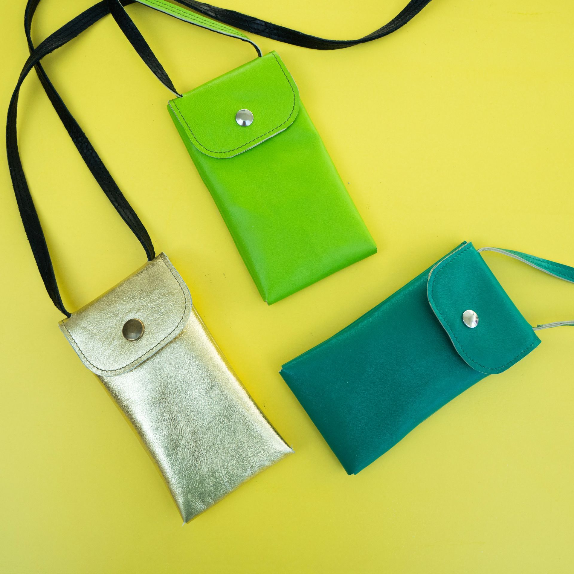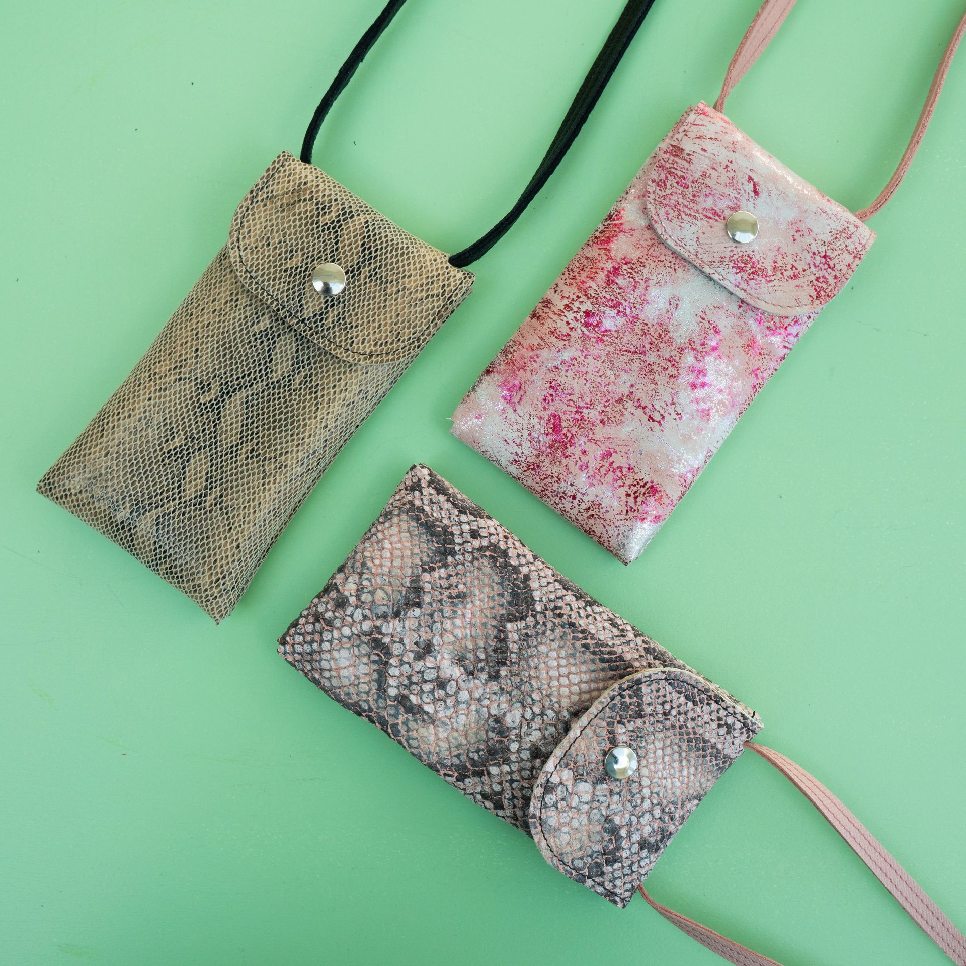 Een eenvoudig telefoontasje van leer om crossbody of om je hals te dragen.